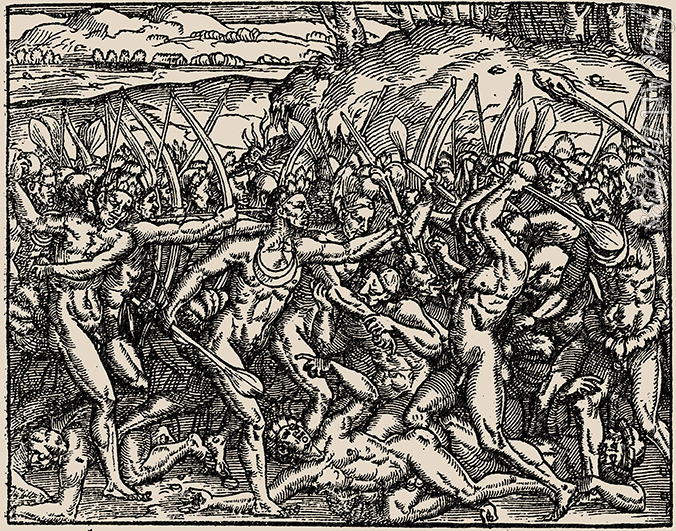 Brasilien. Während Wilde gegeneinander Krieg führen... Aus Cosmografia universal von André Thevet