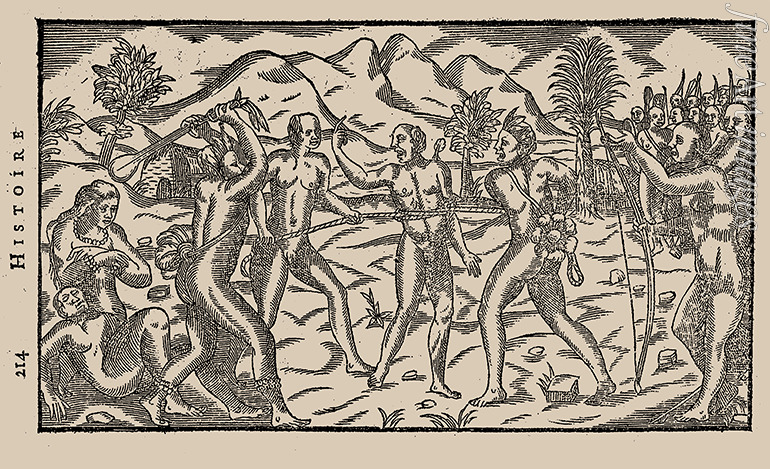 Brasilianische Indianerkrieger nehmen einen Gefangenen. Aus Histoire d'un voyage fait en la terre du Brésil von Jean de Léry