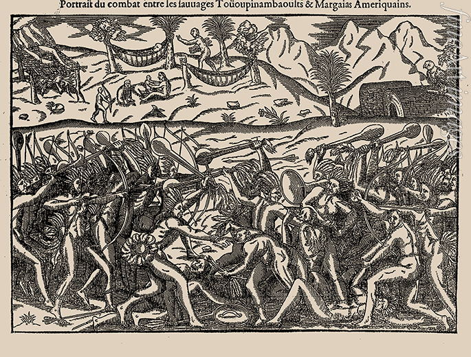 Portrait du combat entre les Sauvages Toüoupinambaoults et Margaias Amériquains. Aus Histoire d'un voyage fait en la terre du B