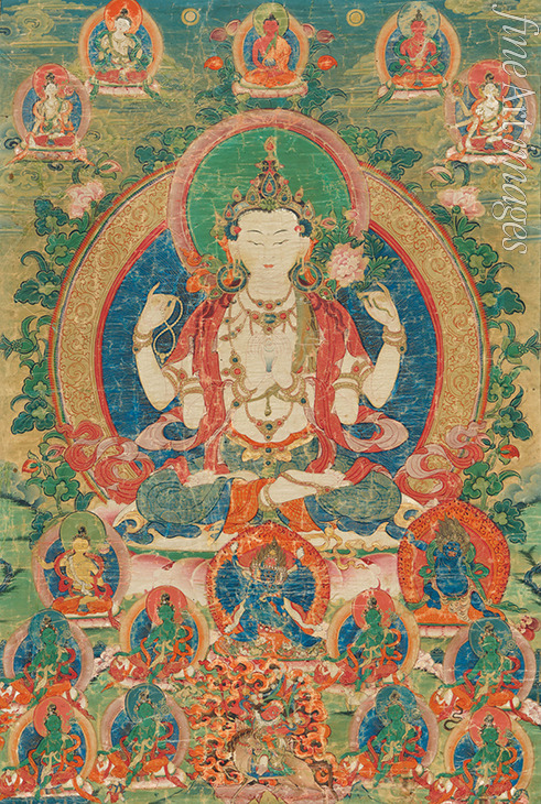 Gottheit, Buddhismus, Rituale, Tibet, Tibetisch-buddhistische Kultur, Himalaya, Hochland von Tibet, Bodhisattva, Avalokiteshvara, Lama, Sadhana, Meditation, Mantras, Yoga, Buddha, Thangka, Tangka, Thanka, Tanka, Amida, Shadakshari Avalokiteshvara, Shadakshari