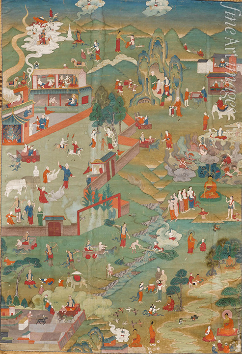 Thangka mit Szenen aus dem Leben Buddhas