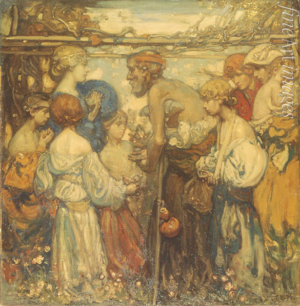 Armut, Symbol, Jugendstil, Krank, Mitleid, Allegorie, Dankbarkeit, Dankbar, Barmherzigkeit, Nächstenliebe, Wohltätigkeit, Almosen, Erbarmen, Wohltat, Gnade, Güte, Herzensgüte, Hilfe, Hilfsbedürftig, Caritas, Wiener Secession, Art nouveau, Modern Style, Modernisme, Stile Liberty, Reformstil, Stil Modern, Fin de siècle