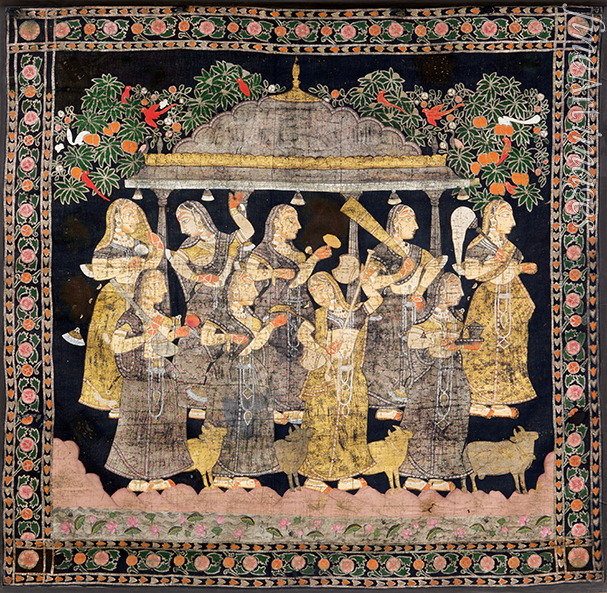 Indien, Harivamsha, Harivamsa, Mahabharata, Indische Gottheit, Krishna, Dwaraka, Krishna mit Radha, Krishna und Radha, Radha, Pichwai, Pichvai, Pichhwai, Gopis, Gopikas