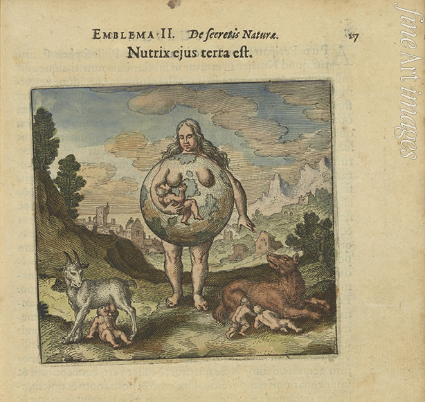 Emblem 2. Die Erde ist seine Amme. Aus Atalanta fugiens von Michael Maier