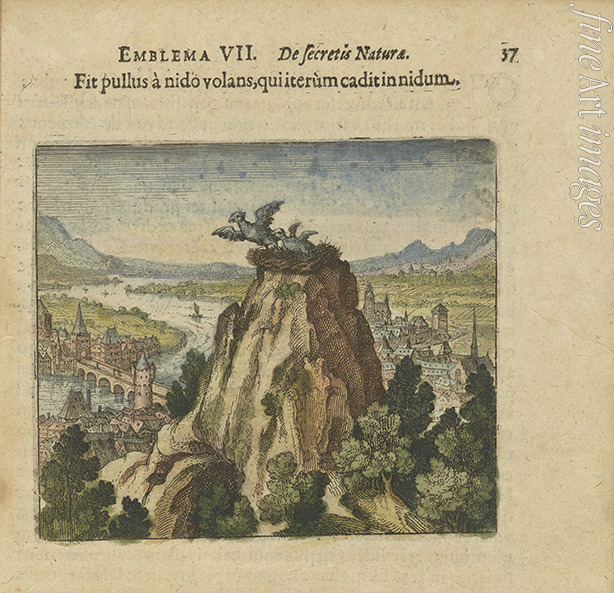 Emblem 7. Der Vogel jung vom Neste fliegt und fällt wieder ins Nest. Aus Atalanta fugiens von Michael Maier