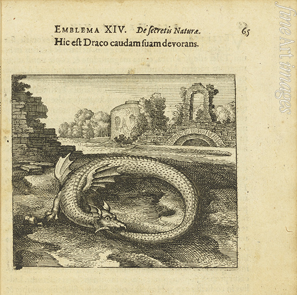 Emblem 14. Dies ist der Drache, welcher seinen eigenen Schwanz frißt. Aus Atalanta fugiens von Michael Maier