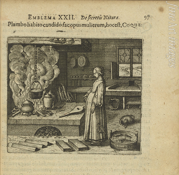 Emblem 22. Wenn du hast das weiße Blei, so mache der Weiberwerk, das ist kochen. Aus Atalanta fugiens von Michael Maier
