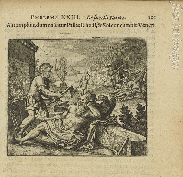 Emblem 23. Es regnet Gold, während Pallas wird zu Rhodus geboren, und die Sonne bei Venus liegt. Aus Atalanta fugiens von Mich