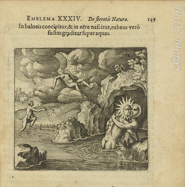 Emblem 34. Im Wasserbad wird er empfangen und in der Luft geboren, wenn er aber rot geworden, geht er aus dem Wasser. Aus Atala