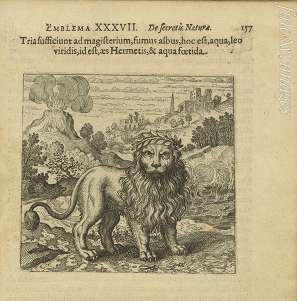 Emblem 37. Drei Dinge genügen zur Meisterschaft, der weiße Rauch, das ist Wasser, der grüne Löwe, das Erz Hermes, und das sticke
