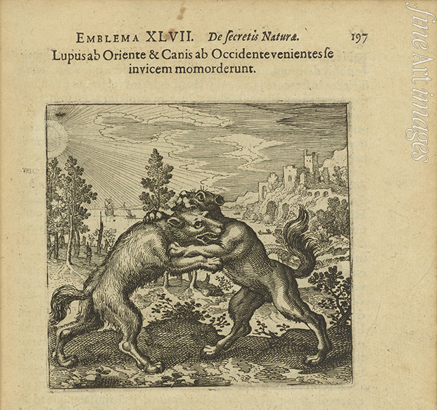Emblem 47. Der Wolf vom Aufgang und der Hund vom Niedergang kommend haben sich untereinander gebissen. Aus Atalanta fugiens vo