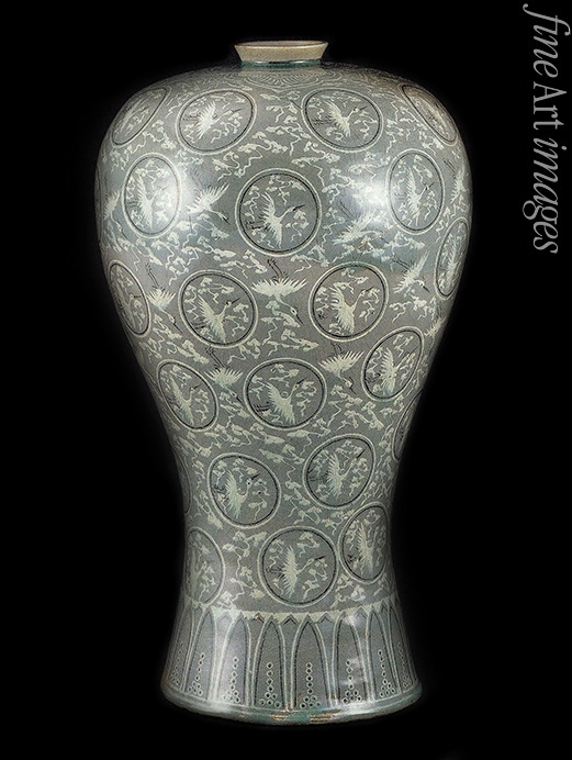 Seladon-Vase, dekoriert mit eingelegten Kranich-Medaillons und stilisierten Wolken. Nationalschatz Nr. 68