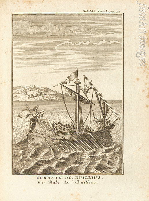 Corvus (Enterbrücke) von Gaius Duilius. Illustration aus Geschichte von Polybios