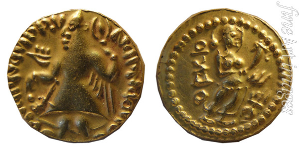 Imitation einer Kuschana-Münze aus Samatata. König Kanishka (Vorderseite), Göttin stehend (Rückseite)