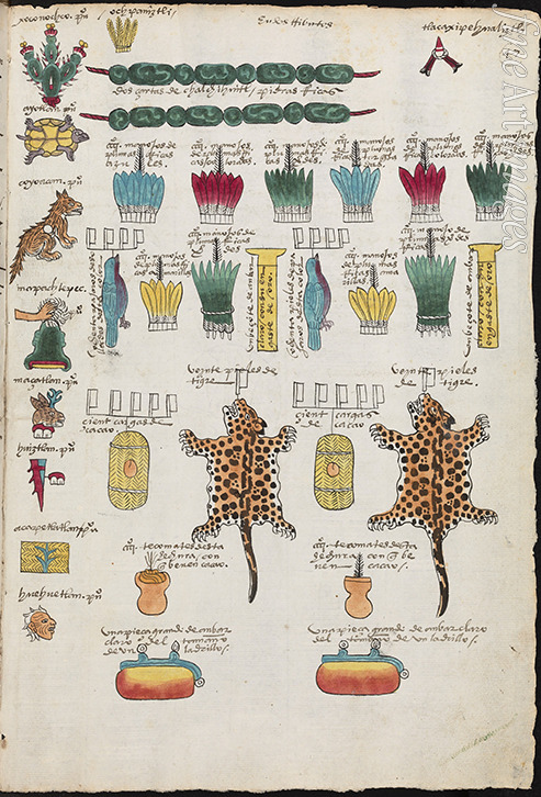 Handschrift, Buchmalerei, Manuskript, Bilderhandschrift, Azteken, Mesoamerika, Primitivgeld, Währung, Zahlungsmittel, Tauschmittel, Zahlungsverkehr, Geschichte des Geldes, Geldgeschichte, Codex Mendoza