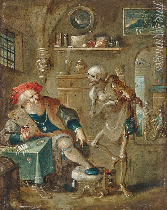 Tod, Ewigkeit, Geld, Vanitas, Leben und Tod, Todessymbolik, Eitelkeit, Symbole, Eitel, Vergeblich, Vergänglich, Memento mori, Nichtigkeit, Menschlichkeit, Sündiger, Verschulden, Gier, Fülle, Gerechtigkeit, Reichtum, Wohlstand, Vermögensstand, Vermögen, Tod eines Geizhalses, Geizhals