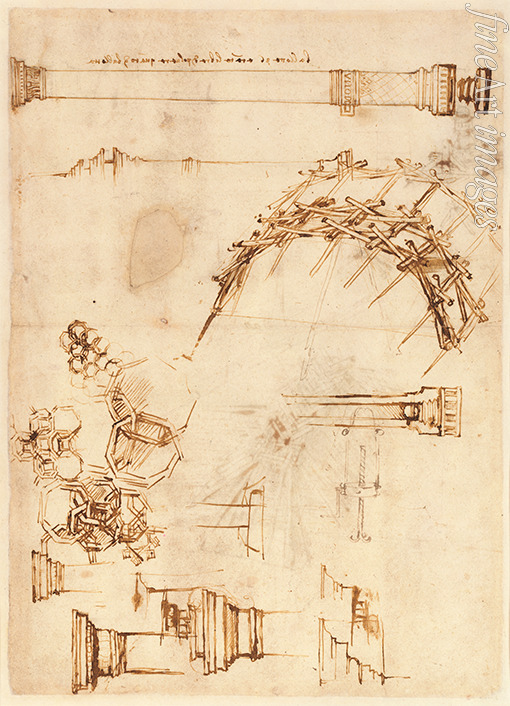 Codex Atlanticus, folio 71 verso: eine provisorische militärische Holzbrücke und ein Artilleriegeschütz