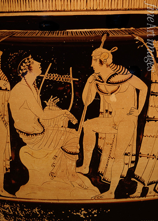 Vase, Musik, Römische Mythologie, Ovid, Metamorphosen, Griechische Antike, Römische Antike, Lyra, Harfenspielerin, Harfenistin, Harfe, Antike Literatur, Euridike, Orpheus, Harfenspiel, Harfenspieler, Harfenist, Krater, Gefäß, Kelchkrater, Keramik, Vasenmalerei, Attische Vasenmalerei, Rotfigurige Vasenmalerei, Rotfigurige Keramik, Rotfiguriger Stil, Attika, Harfner, Harfnerinnen
