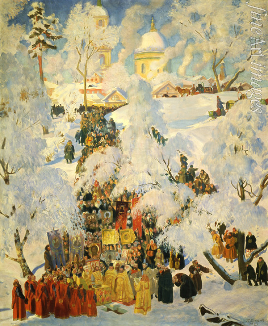 Winter, Winterlandschaft, Schnee, Frost, Jahreszeiten, Volksfest, Jugendstil, Russland, Winterszene, Genreszene, Folklore, Tradition, Brauchtum, Russischer Winter, Pilger, Pilgerfahrt, Orthodoxe Kirche, Russische Kirche, Wiener Secession, Kirchliches Fest, Epiphanie, Art nouveau, Modern Style, Modernisme, Stile Liberty, Reformstil, Stil Modern, Fin de siècle, Wallfahrt, Grosse Wasserweihe, Wasserweihe