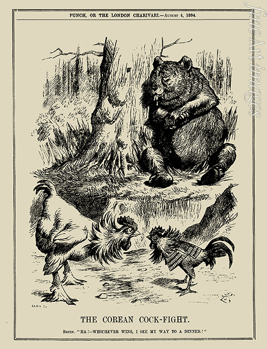 Der koreanische Hahnenkampf. Bär: Ha! - Wer auch immer gewinnt, ich sehe meinen Weg zum Abendessen! Punch, 4. August 1894