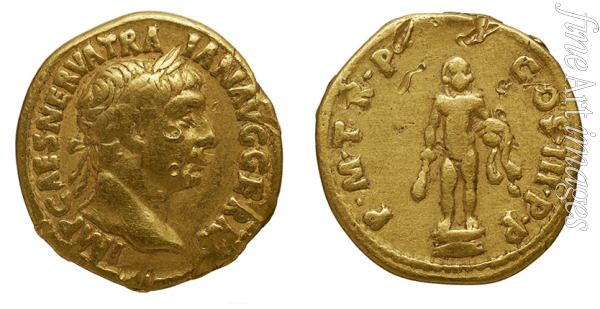 Aureus des Trajan. Vorderseite: Lorbeerkopf Trajans, rechts. Rückseite: Statue des nackten Herkules