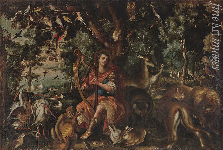 Orpheus bezaubert Bäume und Tiere mit seinem Harfenspiel
