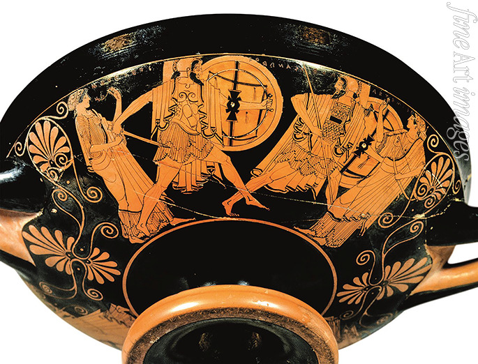 Kylix: Die Verfolgung des Paris durch Menelaos, begleitet von Aphrodite
