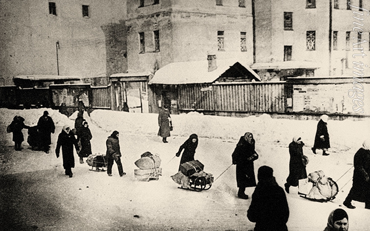 Leningrader Blockade. Menschen bringen ihr Hab und Gut zum Moskauer Bahnhof, 18. März 1942