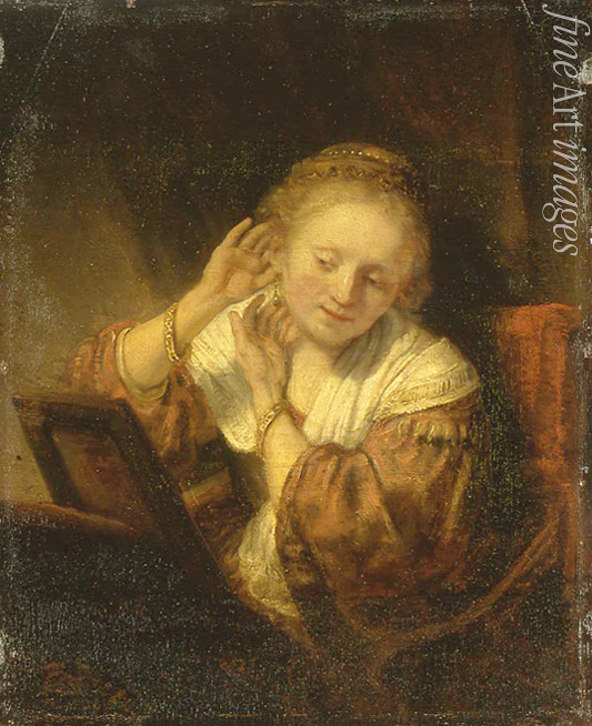 Dame, Mädchen, Frau, Schönheit, Junge Frau, Interieur, Spiegel, Toilette, Toilettentisch, Barock, Schlafzimmer, Nachthemd, Aufstehen, Aufwachen, Bett, Bettkante, Frauenbildnis, Frauenporträt, Bildnis, Holland, Schmuck, Junge Frau, die Ohrringe anprobiert, Negligé, Negligée, Morgenmantel, Perlenschmuck, Perlen, Perlenohrgehänge, Hendrickje Stoffels, Stoffels, Boudoir, Ohrring, Schminktisch