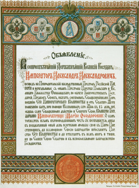 Announcement of the Tsar Alexander III to the Coronation of Tsarina Maria Feodorovna