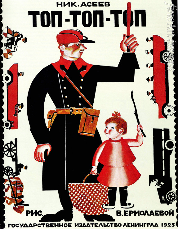 Russia, Children, Women's art, Russian Avant-garde, Automobile, Monochrome picture, black-and-white, Children's Book, Children Book, blackwhite, Motor car, Car, Militsiya, Militia, Road Traffic Safety, Police, Vehicle, Vehicles, Nikolay Aseyev, Aseyev, Politsiya, Traffic controller, Aseev