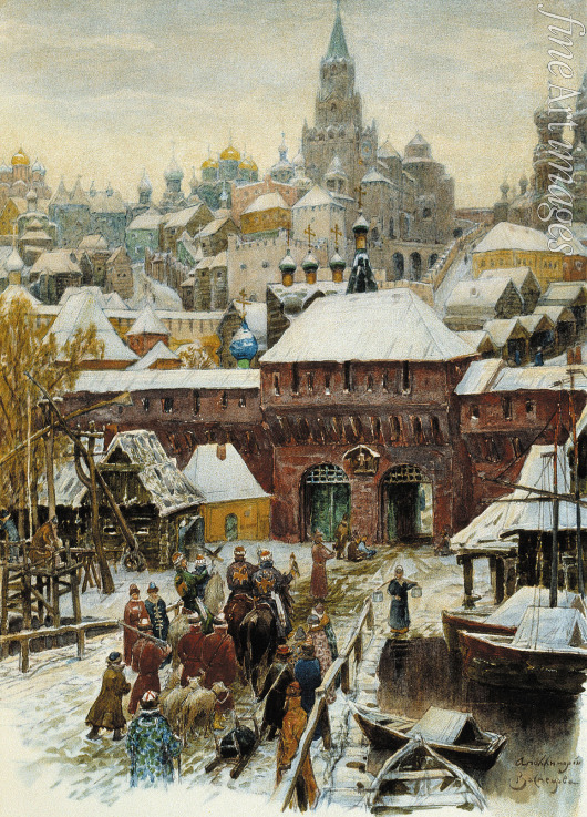 Keywords: Winter, Cityscape, Bridge, Russian architecture, Town, Tradition, City, Genre scene, Folklore, Traditional, Architecture, Moscow, Russian History, Russian winter, Kremlin, Moscow Kremlin, History of Russia, Muscovy, Moscow principality, Grand Duchy of Moscow, Ancient Russia, Muscovite boyar, Knyaz, Russian folklore, Resurrection Bridge, Peredvizhniki, The Wanderers, The Itinerants, Moscow in the 17th century
