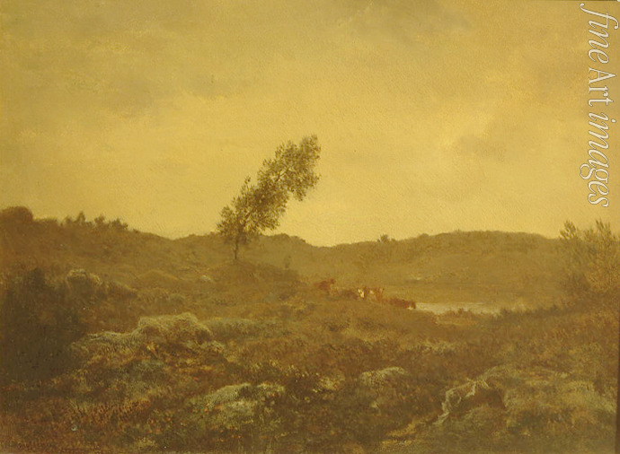 Keywords: Summer, Country side, Nature, Seasons, Poetry, Trees, Valley, France, Time of Day, Lighting, River, Meadow, Idyll, Evening, Hill, Cattles, Cow, Cows, Forest, Barbizon, Realism, Twilight, Romantic landscape, Edge of the forest, Silence, View in Barbizon, French painting, Fontainebleau