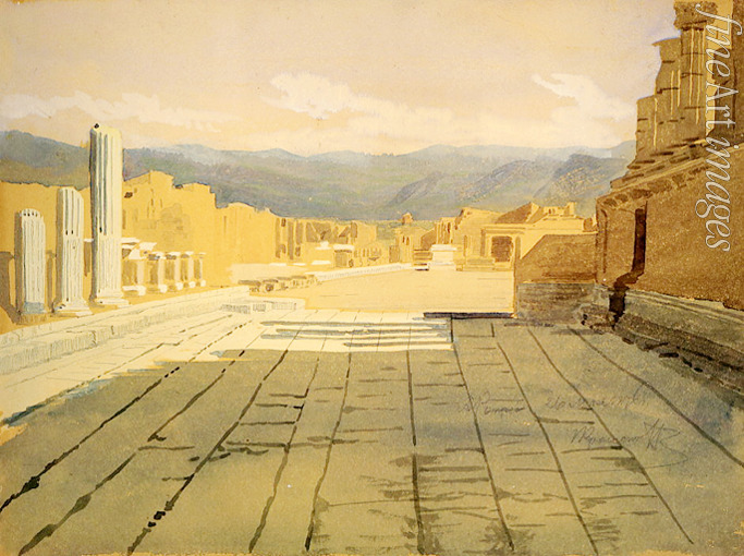 Keywords: Italy, View, Italian landscape, Ancient Rome, Water colour, Ruins, South Italy, Ancient Architecture, Bay of Naples, Vesuvius, Monte Vesuvio, Vulcano, Roman Empire, Pompeji, Pompeii, Roman city, Destroyed city, Forum, Peredvizhniki, The Wanderers, The Itinerants, Mount Vesuvius