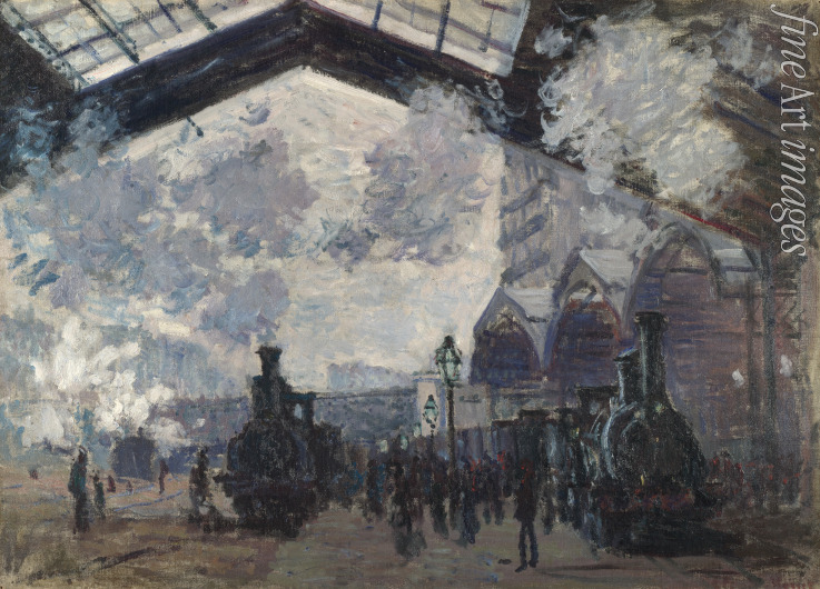 Keywords: Paris, Cityscape, France, Lighting, Evening, Impression, Horse, Smoke on the Paris circuit line, Rail, Railway, Railroad, Railway station, Train, Platform, Travel, Steam engine, French painting, Transport, Rail transport, History of rail transport, Steam locomotive, Locomotive, Steam train, Trains, Gare Saint-Lazare, Saint-Lazare, Saint Lazare, History of Technology, Rail Station, Train travel
