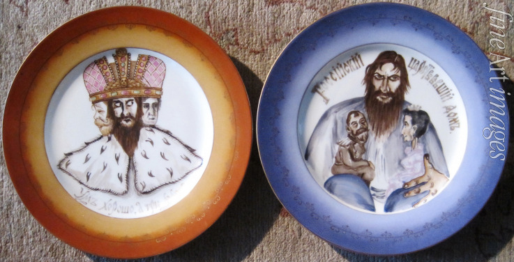 Title:Two plates with with caricatures on Grigory Rasputin and Nicholas II of Russia