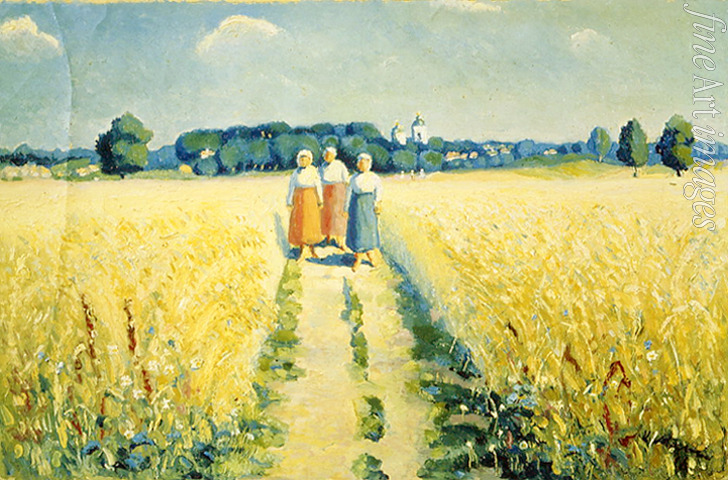 Keywords: Summer, Decorative, Country side, Summer landscape, Colourfulness, Woman, Field, Peasant, Russia, Women, Tradition, Harvest, Folklore, Traditional dress, Russian Avant-garde, Reaper, Harvester, Wheat, Country village, Traditional costume, Three women on the road, Wheat field, Cubofuturism, Cubo-Futurism