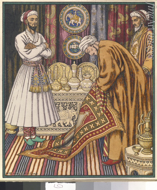 Prince Ali buying a carpet. Illustration for Arabian Fairy Tales