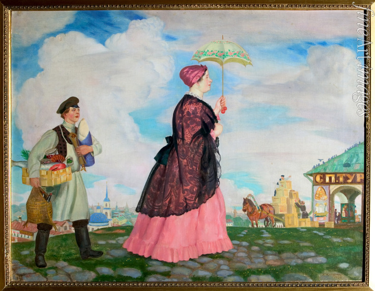 Decorative, Cityscape, Russia, Church, Houses, Weekday, Street scene, Genre scene, Walk, Folklore, Traditional, Province, Umbrella, Street, City life, Market woman, Bell tower, Place, Merchant's woman