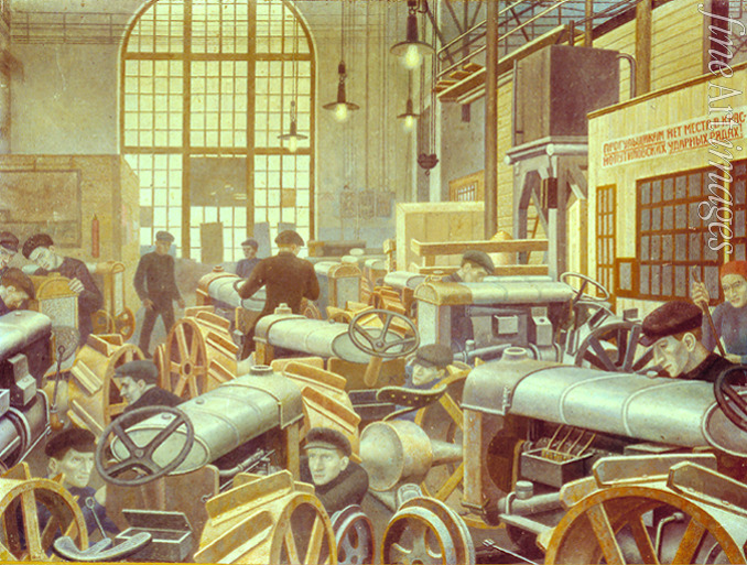 Russia, Worker, Job, Russian Avant-garde, Petrograd, Work, Tractor assembly shop of the Putilov factory, Tractor, Tractors, Factory, Industrialization, Industry, Assembly shop, Heroes of Socialist Labor, Five-Year Plan, Shock work, Shock worker, Shock work movement, Five Year Plan