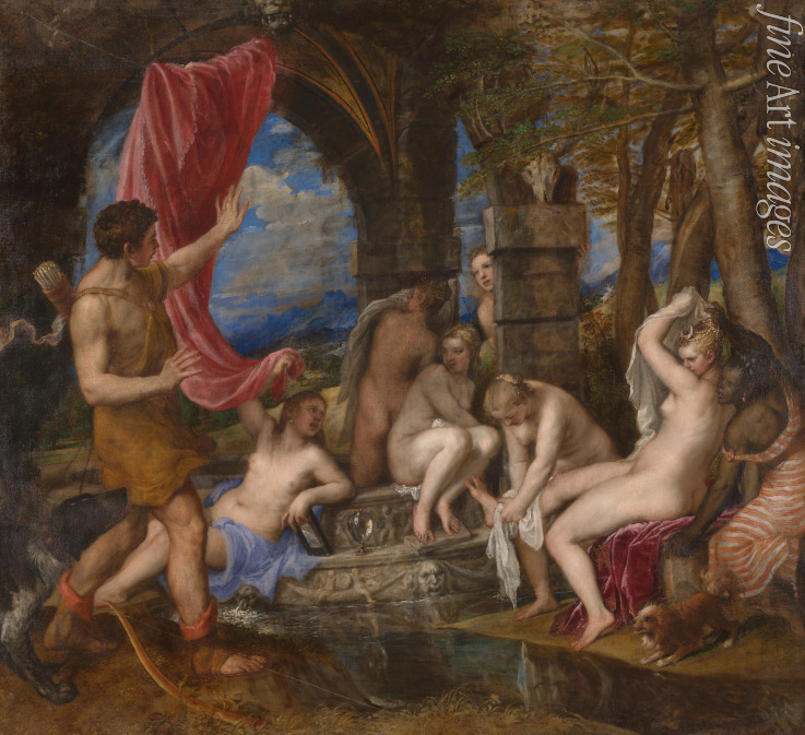 Nude, Nudity, Lady, Nude woman, Woman, Bathing, River, Beauty, Banks, Bathers, Barock, Diana, Godess of hunting, Mythology, Forest, Stag, Roman mythology, Greek Mythology, Ancient Rome, Diana and Actaeon, Hunter, Hunting, Boeotia, Nymphes, Transformation, Metamorphosis, Hounds, Godess, Akt, Actaeon, Tizian, Artemis