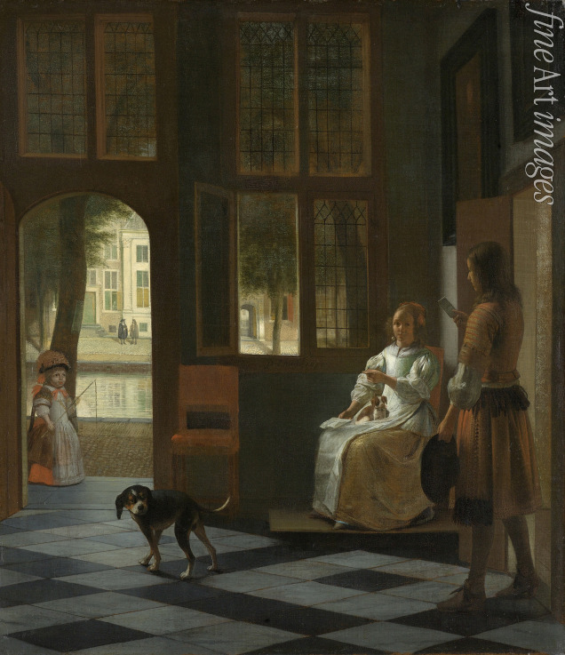 Lady, Love, Lovers, Young Woman, Interior, Barock, Dog, Holland, Rendezvous, Genre scene, Embrace, Tryst, Letter, Amusing, Amorous, Love relationship, Love letter, Note, Message
