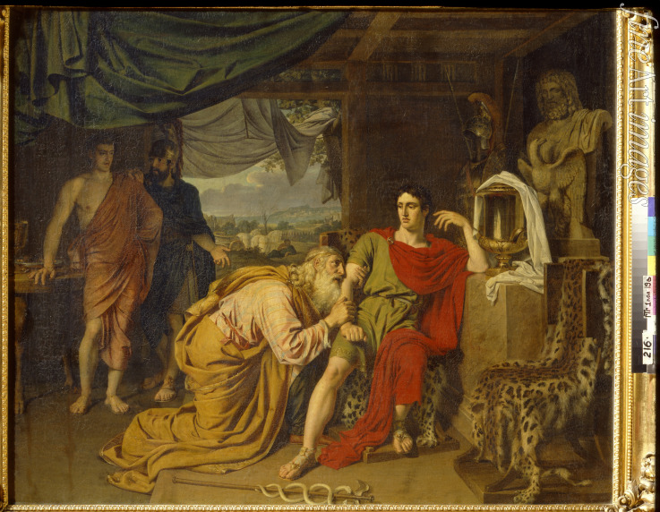 Priam tearfully supplicates Achilles, begging for Hector's body