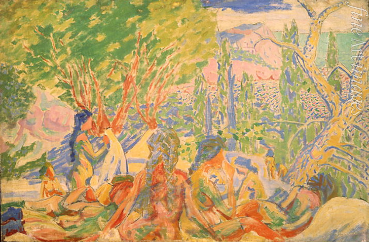 Keywords: Summer, Seasons, Sun light, Trees, Nude, Nudity, Colourfulness, Lady, Noon, Time of Day, Lighting, Nude woman, Sea, Sea landscape, Woman, Bathing, On the banks, Seashore, Bay, Beach, Impression, Rocks, Russia, Bathers, At the water, Coast, Recovery, Russian Avant-garde, Expressive, Holiday, Black Sea, Crimea, South, Health resort, The Gulf of the Crimea, Gulf of the Crimea, In the Crimea, Jack of Diamonds, Knave Of Diamonds, Neo-Primitivism