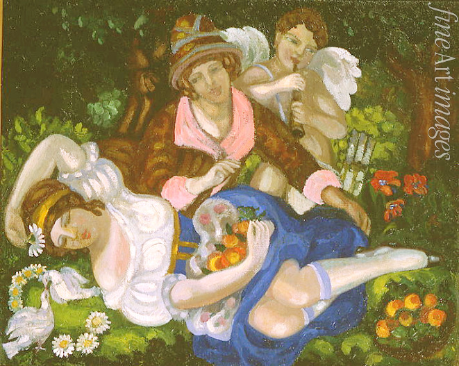 Keywords: Jugendstil, Erotic, Roman mythology, Greek Mythology, Pastoral, Roman Gods, Place-spirits, God of free Nature, Pan, Fertility, Wood spirit, Amorous, Loveplay, Cupid, Pastoral scene, Faun, Art nouveau, Modern Style, Modernisme, Stile Liberty, Reformstil, Wiener Secession, Stil Modern, Fin de siècle, Soudeikine, Soudeikin, Amor, Faunus
