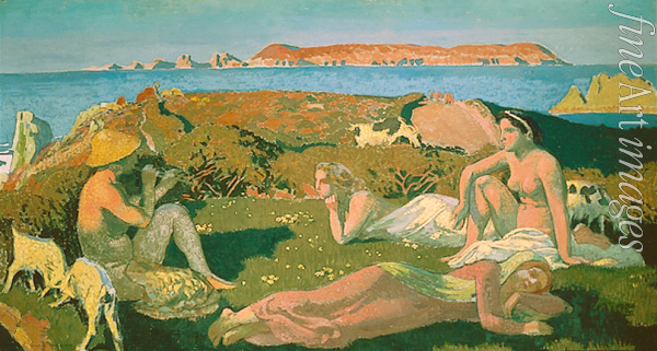 Keywords: Decorative, Local Colours, Fauvism, Nature, Poetry, Music, Sun light, France, Sunset, Nude, Nudity, Light, Colourfulness, Nude woman, Sea, Sea landscape, South France, Shore, Seashore, Bay, Country life, Water, Flute, Cliffs, Banks, Shepherd, Shepherdess, The green Beach, Pastoral, Musical instruments, Flautist, Perros Guirec, Musical instrument, Flutist
