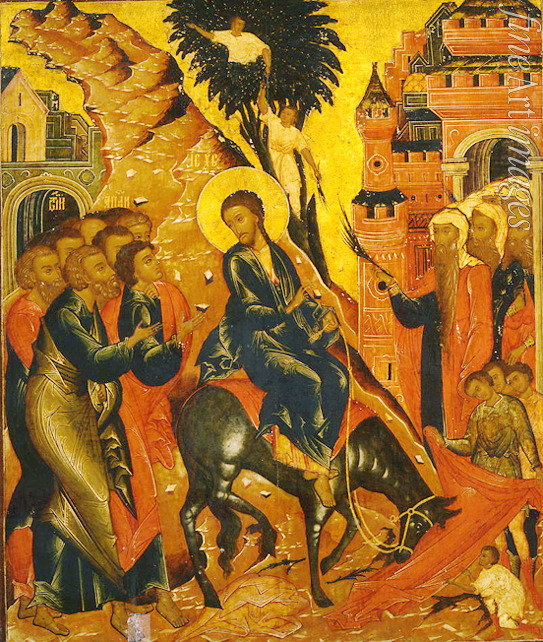 Keywords: Icon Painting, Bible, New Testament, Freedom, Donkey, Messiah, Jerusalem, Orthodox Church, Icon, Russian Church, Easter, Palm Sunday, Goat Willow Sunday, Liturgical Feast, Moveable feast, Jesus Christ, Holy Week, Entry of the Lord into Jerusalem, Holy Town, The Golden Gate, Triumphal Entry, The Entry into Jerusalem, Entry into Jerusalem
