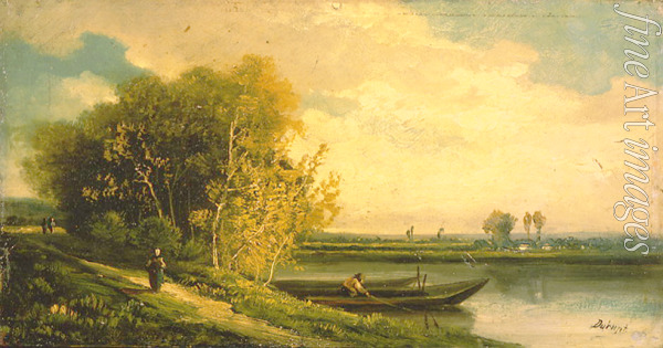 Summer, Country side, Nature, Seasons, Poetry, Summer landscape, Trees, France, Sunset, Lighting, River, Water, Banks, Evening, Riverbank, Boat, Peasant woman, Coast, Fisherman, French painting