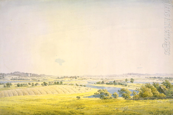 Keywords: Summer, Country side, Nature, Seasons, Poetry, Summer landscape, Trees, Valley, Lighting, River, Field, Meadow, Hill, Romanticism, Romantic landscape, Water colours, North Germany, Island Ruegen, Putbus