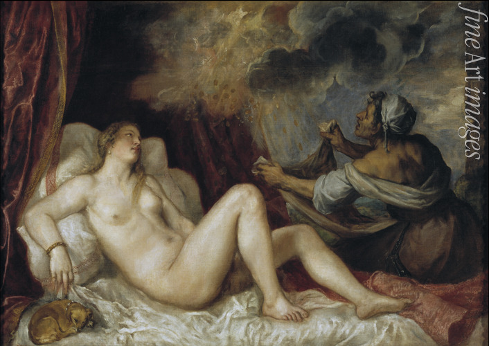 Nude, Nudity, Lady, Nude woman, Body, Beauty, Interior, Renaissance, Greek Mythology, Angel, Palace, In the bed, Palais, Danae, Bronze tower, Shower of gold, Nursemaid, Zeus lover, Ancient Gods, Akt, Tizian